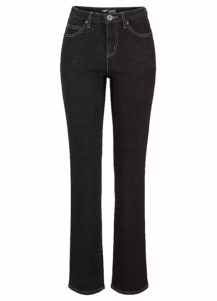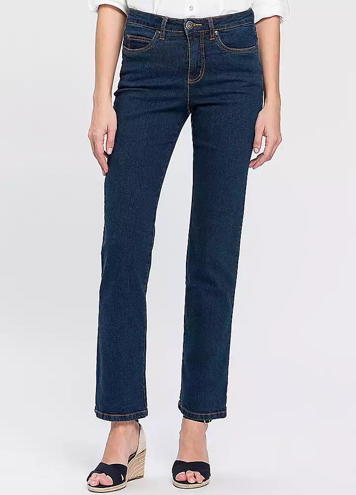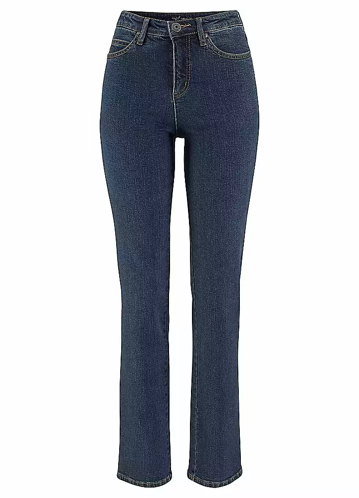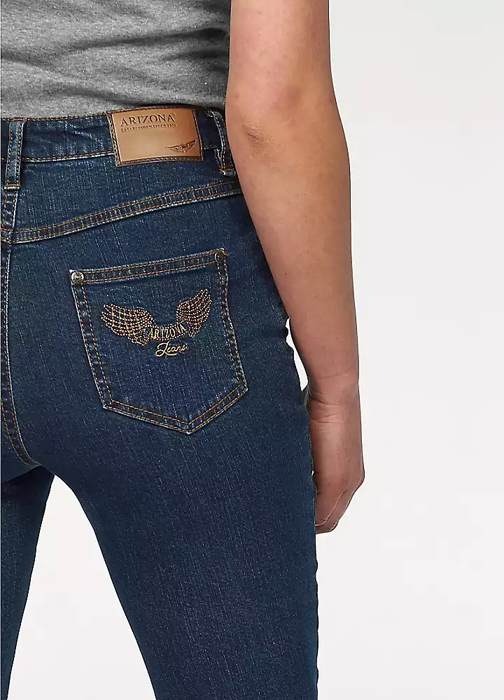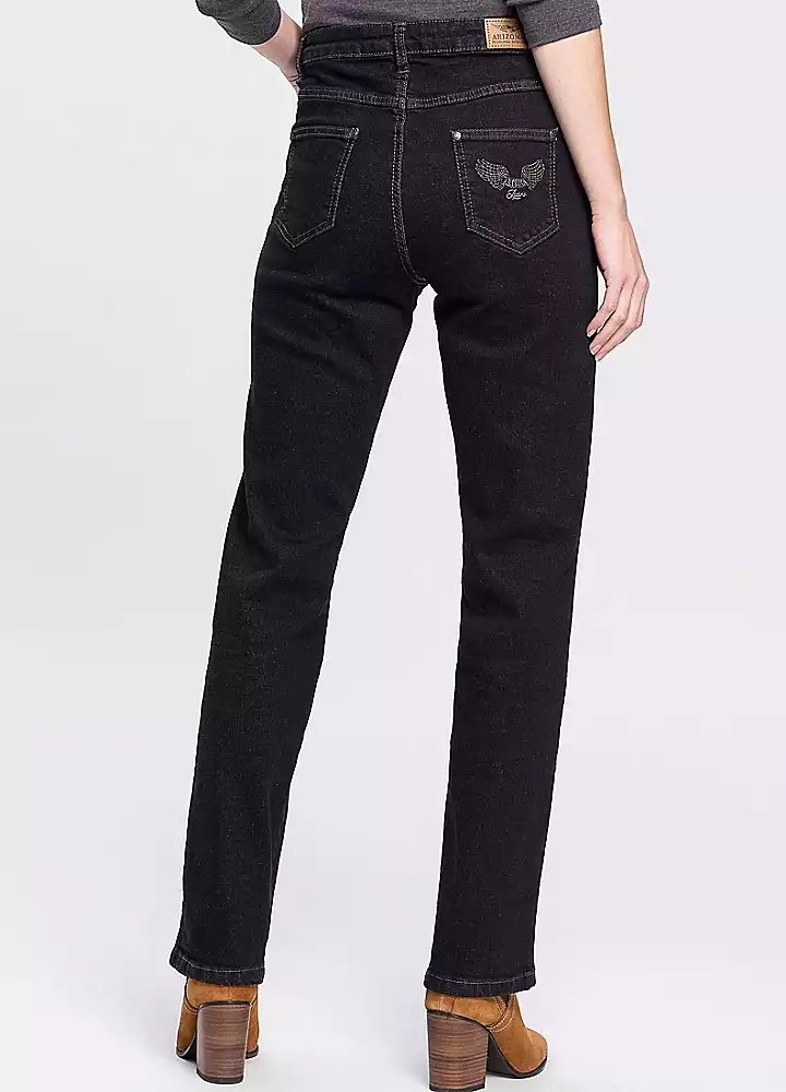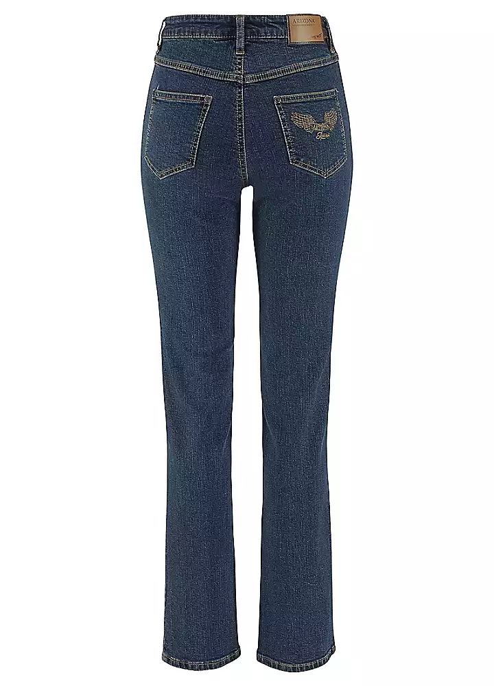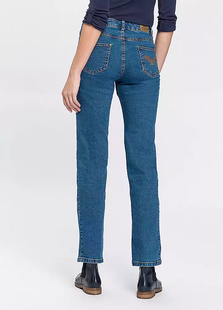 Straight leg in 5-pocket style with contrasting-colour seams and embroidered detail on one back pocket. Soft stretchy fabric