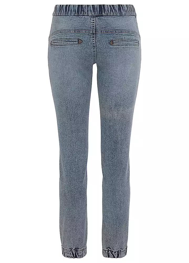 These stylish jeans are in a casual jogger style. They feature an elasticated waistband for added comfort, as well as slit pockets on the front and back.