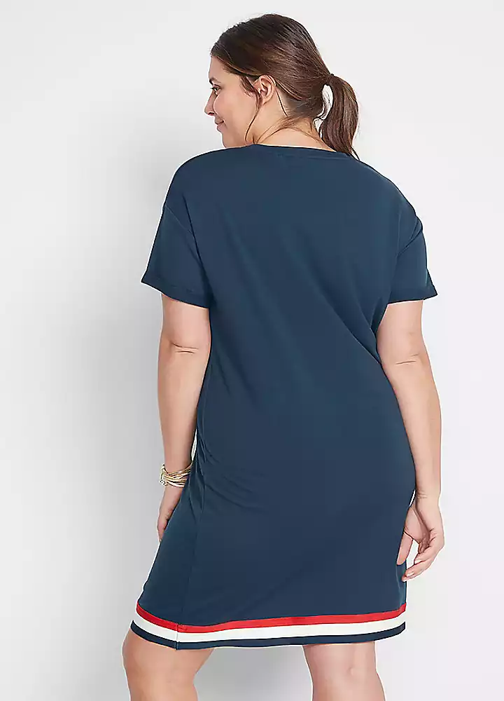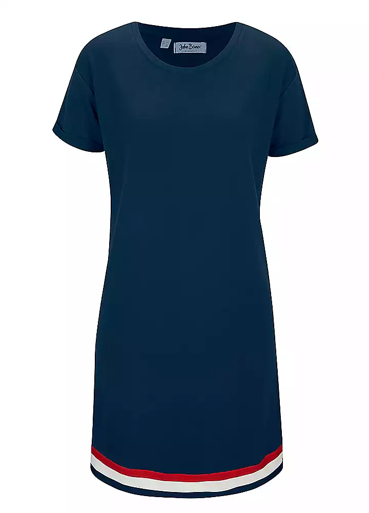Casual sweater dress with a contrast stripe trim hem and turn-up cuff.
