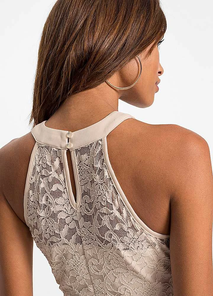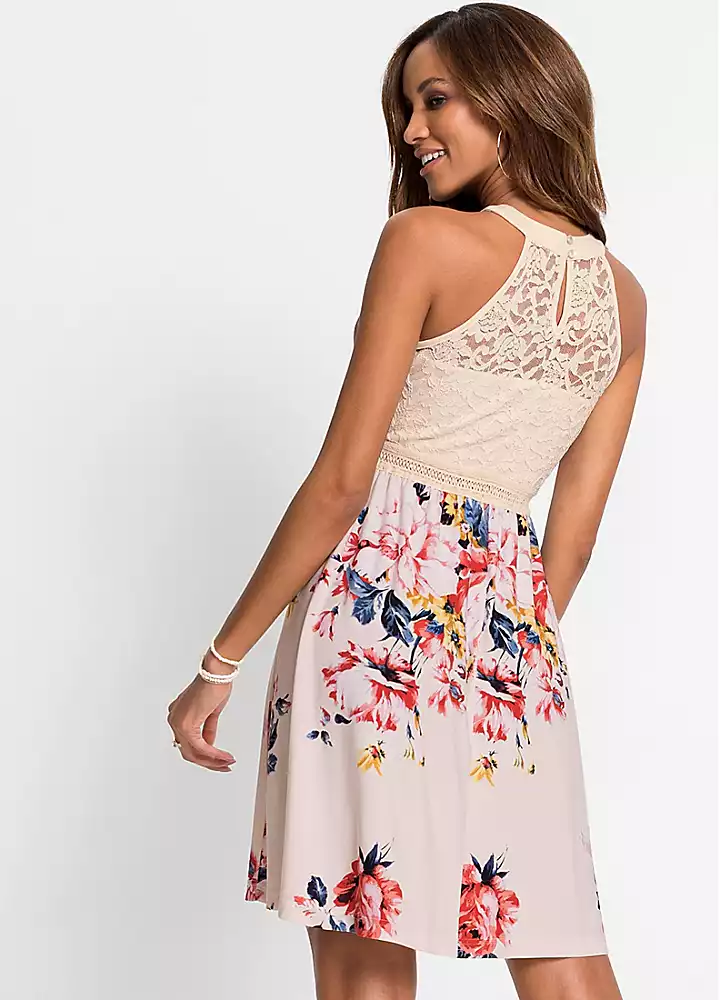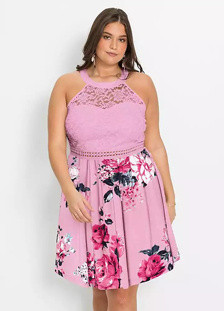 This romantic dress comes with a lace-covered bodice and a floral print skater skirt.