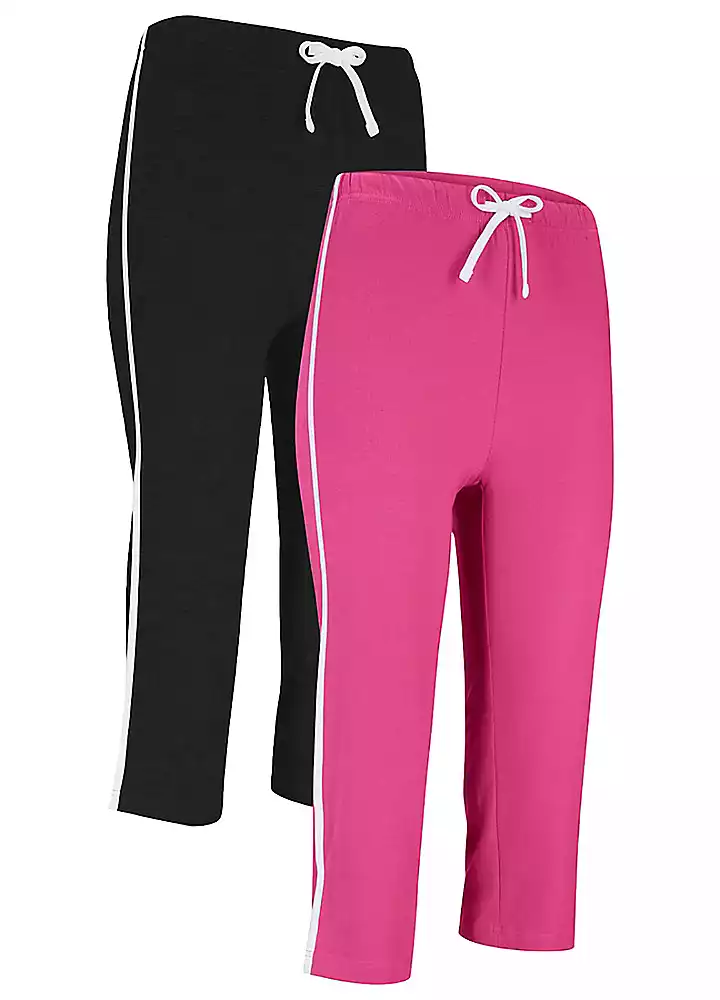 Stylish and great value pack of 2 capris. Ideal for sports or leisure, they feature an elasticated waistband and are finished with contrast piping.