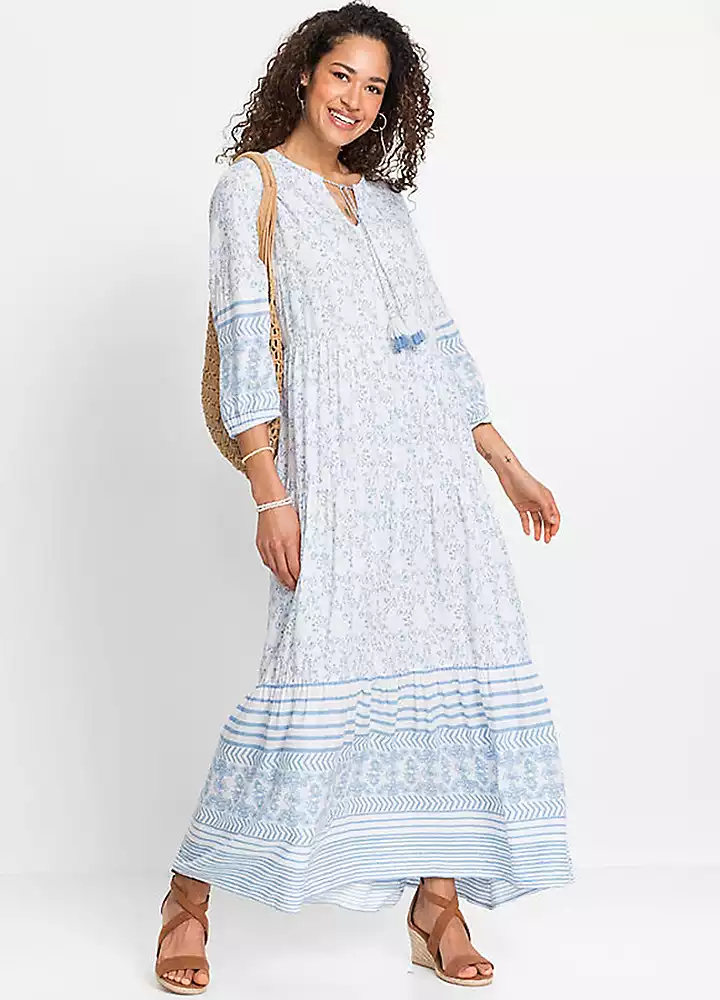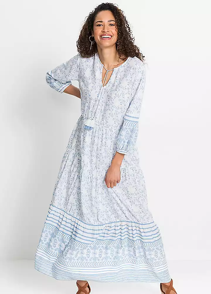 A boho maxi dress in a floral print with tassel ties at the neckline.