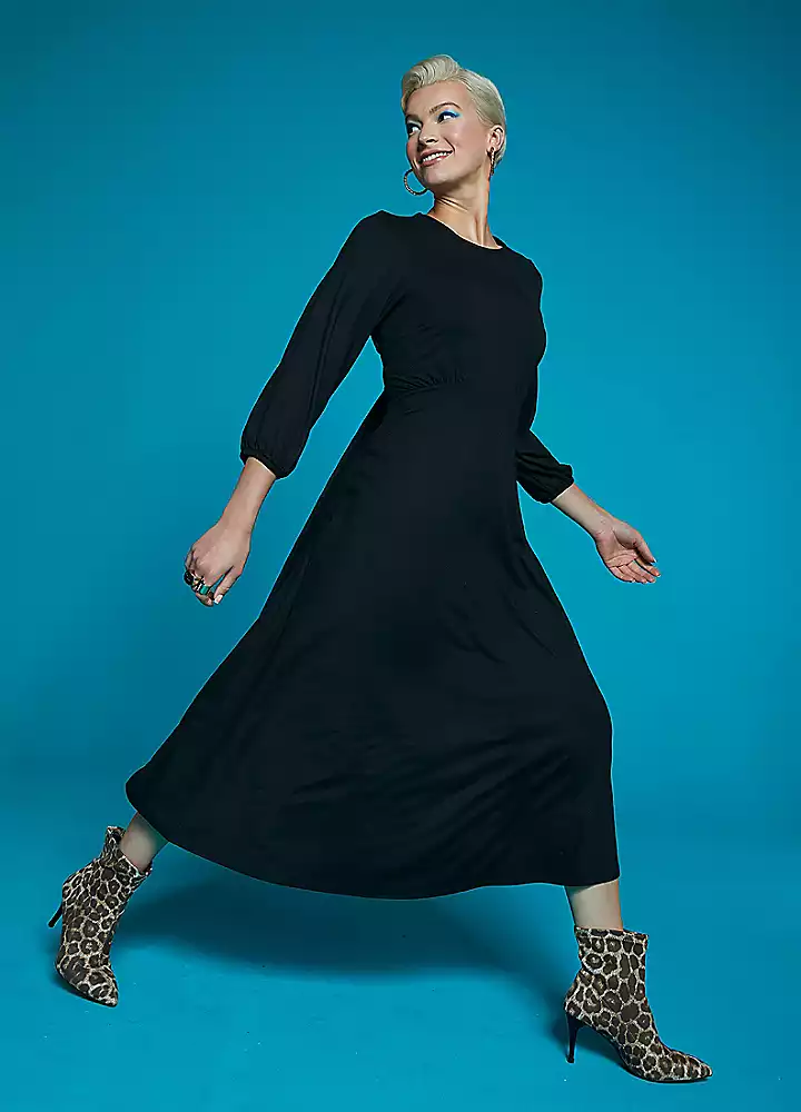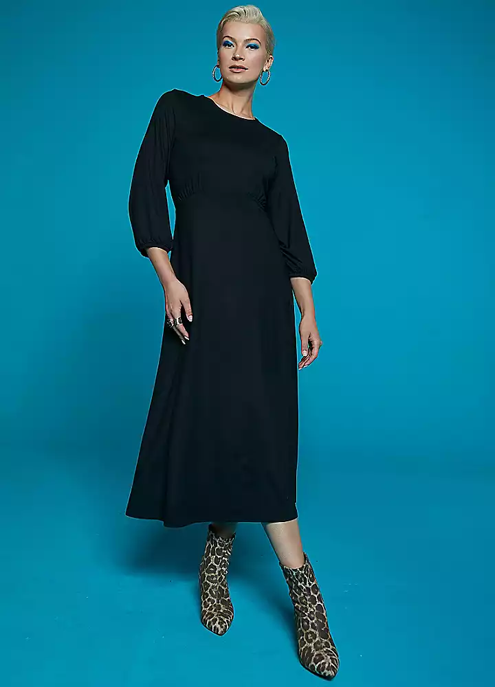 Our black jersey midi dress is perfect for taking you from day to night. With three quarter blouson sleeves it comes with a high scoop neckline and open tie back detail.