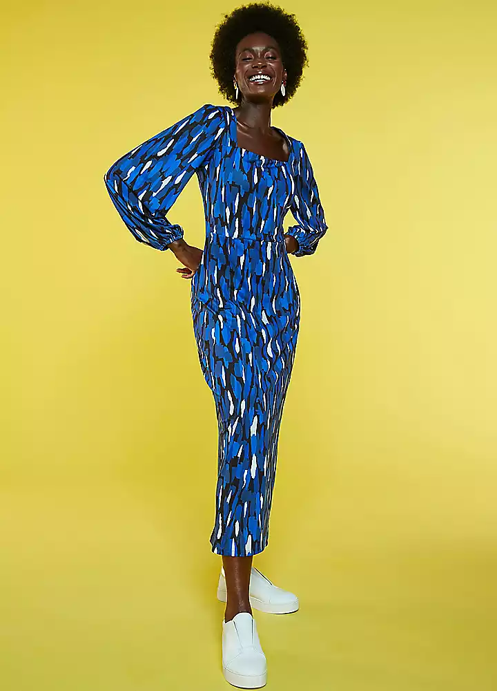 Our square-neck blue print midi dress is perfect for all your daytime needs. This dress looks great teamed with trainers or boots.