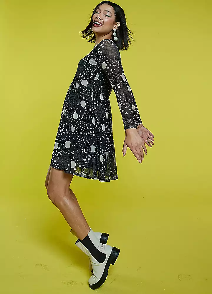 Fun spotty print dress is a perfect addition to your new season wardrobe. The tiered dress features long sleeves and is the perfect dress for layering.