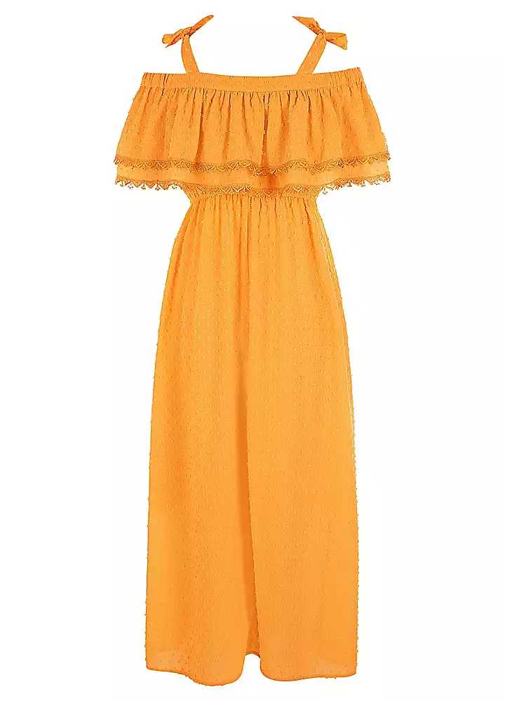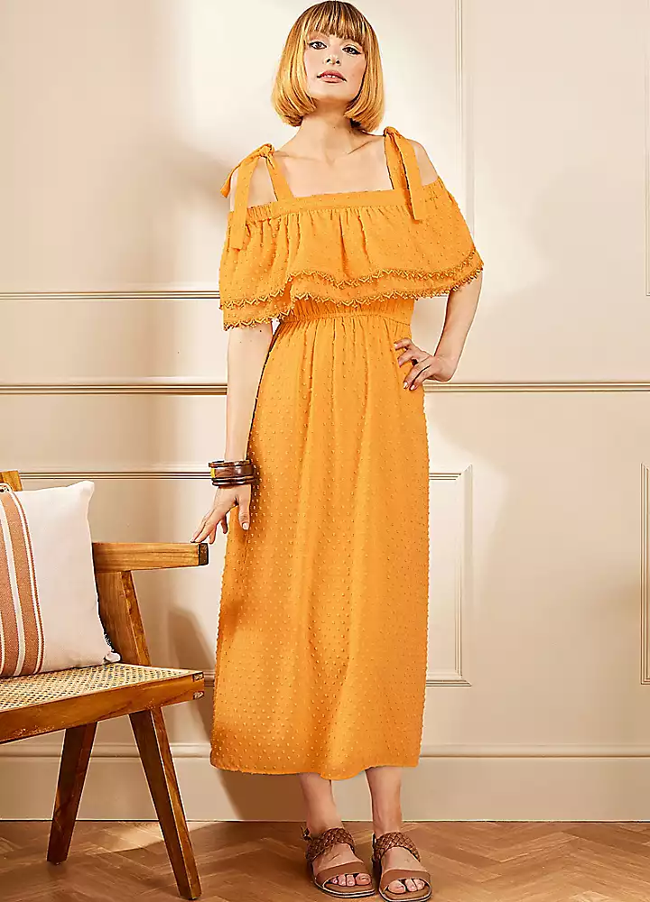 Add a pop of colour to your wardrobe this Summer with our textured dobby Bardot dress. Designed with bow details on the straps, picot trims and a full lining. Style with our brown strappy sandals and beach bag.