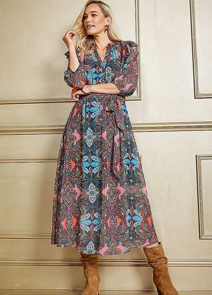 Make a statement with this stunning ethnic floral print dress with gold metallic threads detail. Three-quarter sleeves with elasticated cuffs to pull up to preference. This gorgeous dress is fully lined and features a notch neckline, button front placket, frill sleeve detail and an elasticated waist with a self-tie to cinch in your waist for a flattering fit. Pair back with our gold ankle boots to complement the print and metallic gold thread detail.