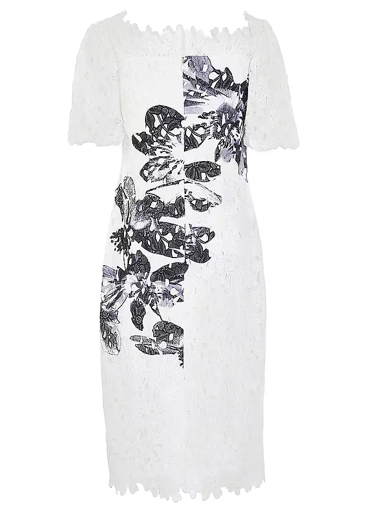 Great update on your staple lace dress. With a square neckline this lace dress is a shift shape and comes with contrast placement print to the front, with puff sleeve detail. Fully lined. Pair with our fascinator for the perfect look.