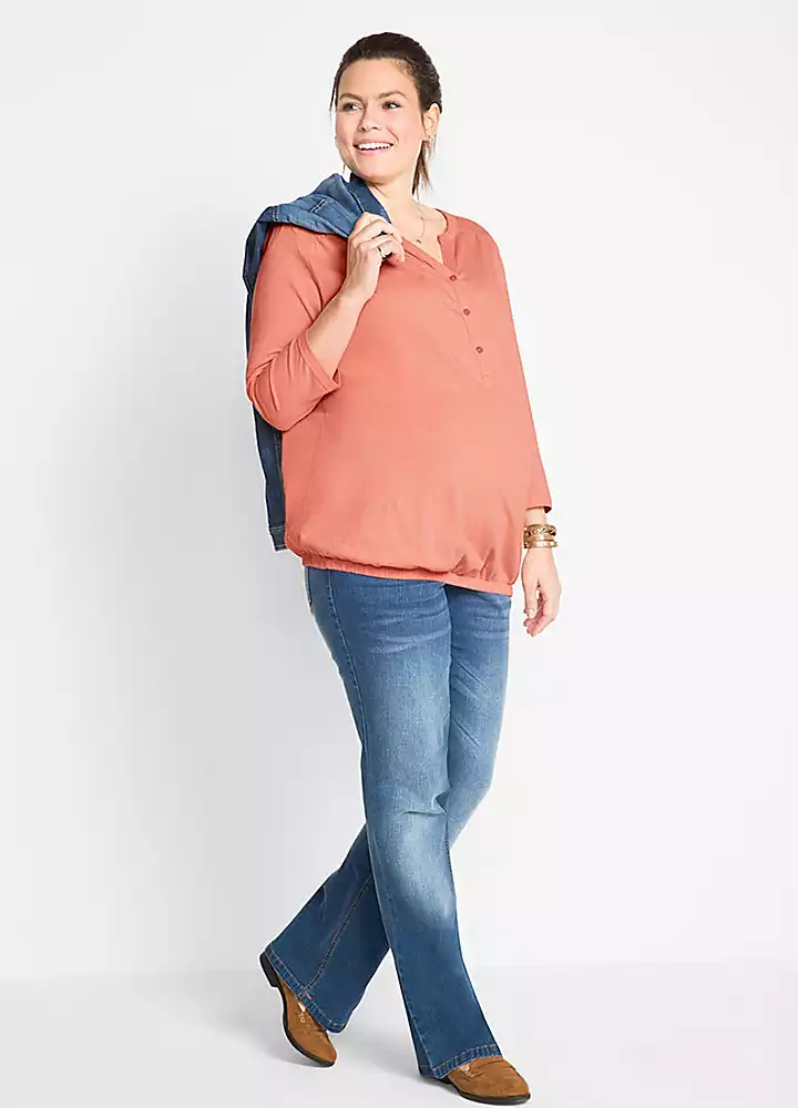 An essential pair of classic boot-cut jeans designed with a comfortable high jersey waistband that you can adjust around your changing shape.