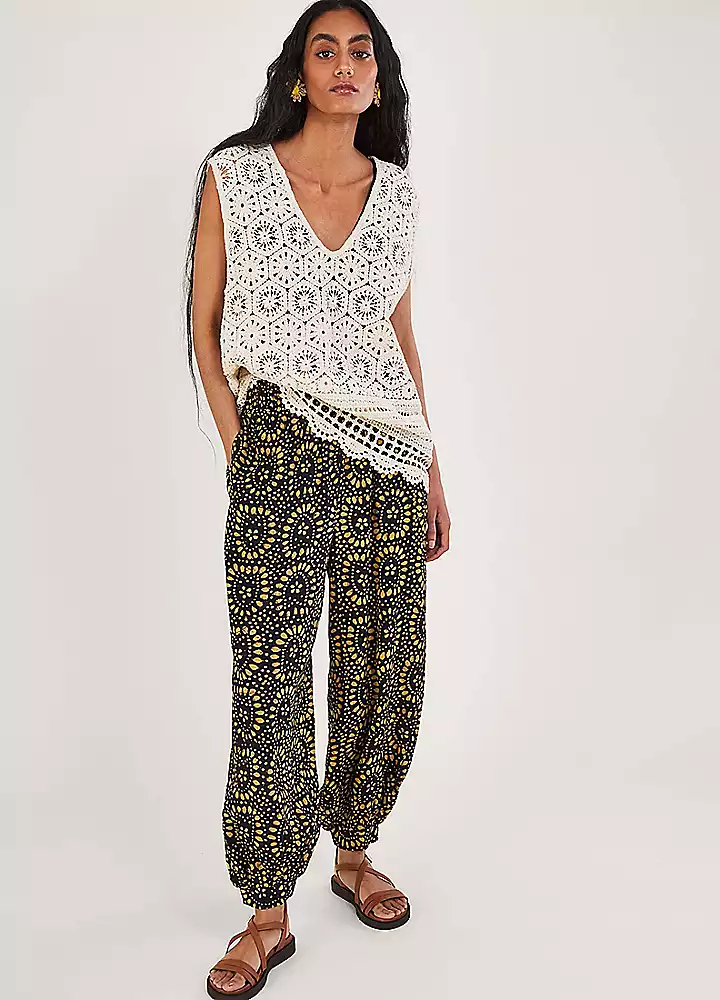 These harem-style trousers are perfect for sunny days mooching around the shops. They feature a vibrant batik print with a comfortable ruched waist and cropped legs. Style them with a white tee and strappy sandals to head out onto the high street. Due to the nature of Batik tie dye, variation in print may occur.