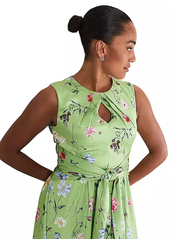 Make a statement in this dress. Designed in a spring-ready green hue with a hand-painted floral pattern our Corrin dress showcases a keyhole detail at the neckline a tie feature across the stomach and a subtle split at the hem. We’ve styled it with pink heels and a matching clutch for the perfect outfit.