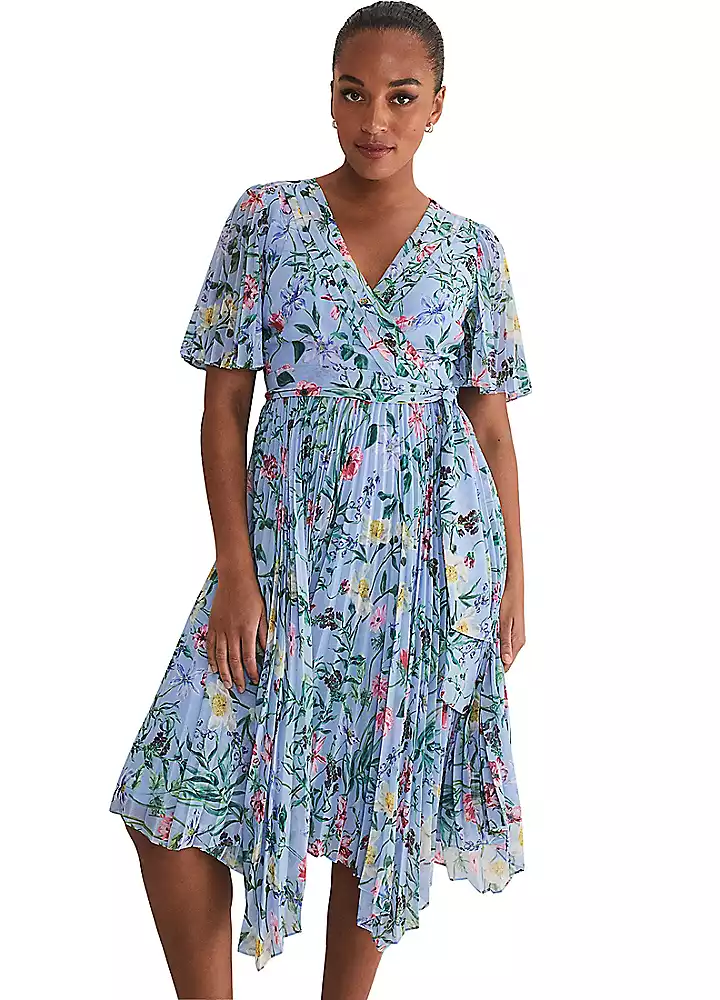 Make a style statement. Designed with a beautiful hand-painted floral print, our Kendall dress features pleated, fluttery sleeves, a wrap-around bodice and a floaty, high-low skirt. Wear with purple accessories to the races, a wedding or just on the days when you feel like wearing an amazing dress!