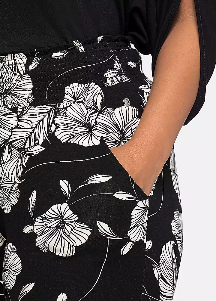 Casual in fit, sporty in style! This is how these soft, flowing beach pants from Sheego show themselves. A wide smocked waistband and elasticated leg ends give them a sporty, feminine look. Practical pockets underline the casual style.