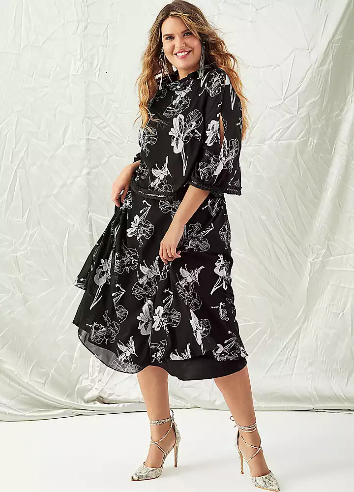 Itβs party time! This eye-catching evening dress is designed with numerous details and a Silver coloured floral print. Made from lined semi-sheer material, its stylish 2-in-1 look is created by a loose-fitting Georgette layer at the bodice with an attractive rounded neckline with tie-band, whilst a V-neck at the back also provides a further feature and gives way to an invisible zip that makes it easy to put on and take off. Sequins and pleats on the bodice hem and sleeves display sophisticated touches, and its sleeves feature slits with adjustable press studs.