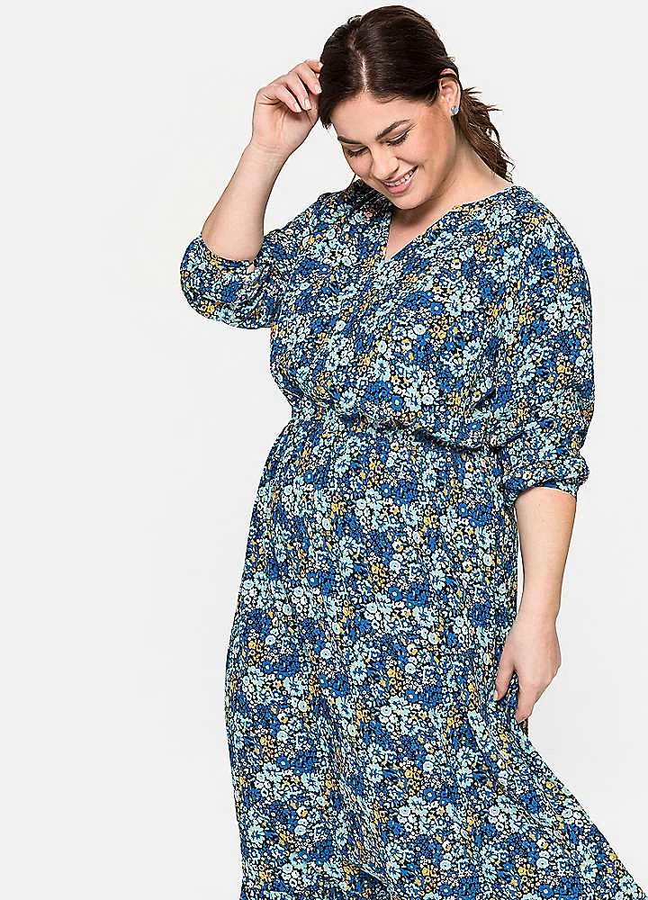 This lovely maxi dress from sheego features a floral all over print that gives it a playful romantic look. It is fitted with a V-neck, elasticated waist, decorative pleats at the back and long sleeves with narrow cuffs and metal buttons. Its slightly rounded skirt hem has a flattering effect and the design is beautifully rounded off by its softly draping material.