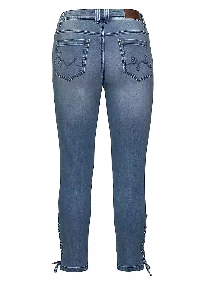 These slim fit ankle length stretch jeans are a must-have item for stylish outfits. Featuring decorative lacing at the leg hems, a light wash with used effects and embroidered rear pockets that round off their look. The stretch denim material makes them comfortable and easy to wear.