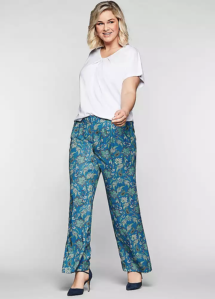 Trousers with wide leg. All-over print. Molding waistband with two buttons and zipper. With waistband folds and two lateral pockets. Made of soft flowing quality.