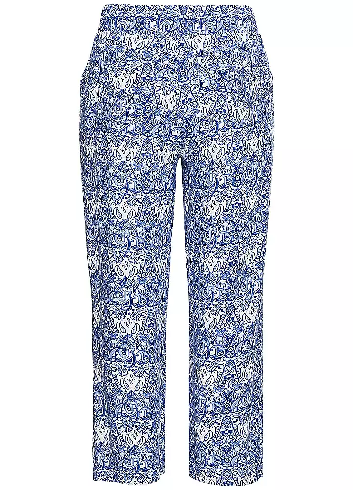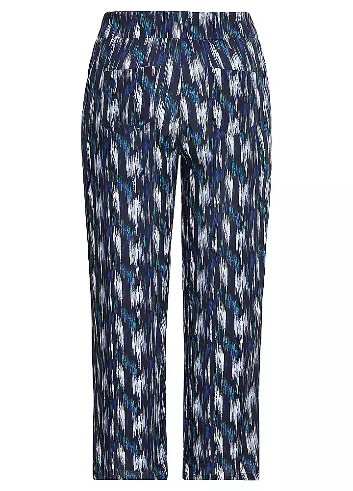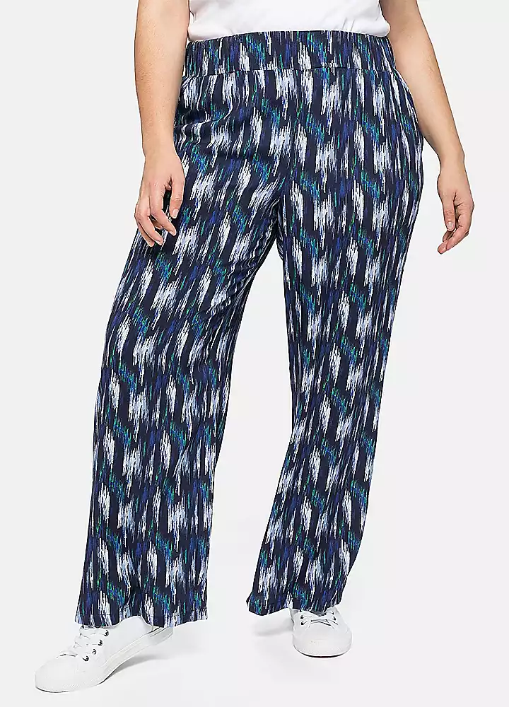 The wide-cut Sheego trousers have a summery touch thanks to the eye-catching pattern. The elastic drawstring waistband is particularly comfortable, two side pockets and two patch pockets on the back complete the look. The casual, wide cut falls pleasantly loose over the legs, the soft, flowing quality is pleasantly light to wear.