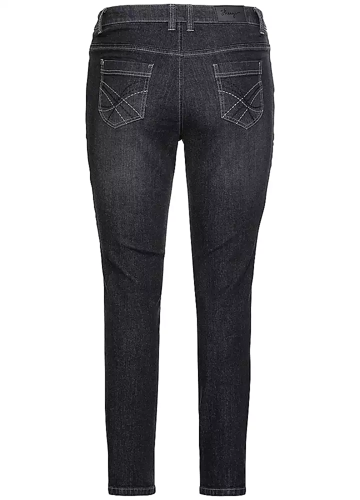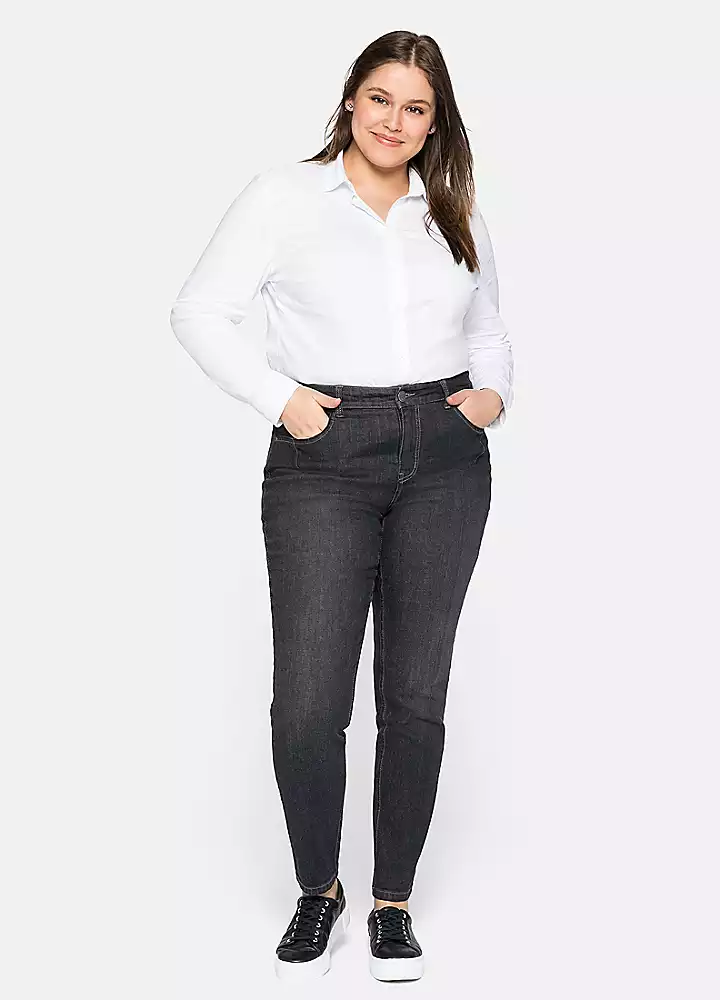 These slim fit jeans from sheego are fitted with integrated knee, length support panels and a shaped waistband that create a flattering bodyshaping effect. These 5 pocket style trousers also feature belt loops and stitched pockets, and their comfortable elasticated material gives them a fabulously comfortable feel.