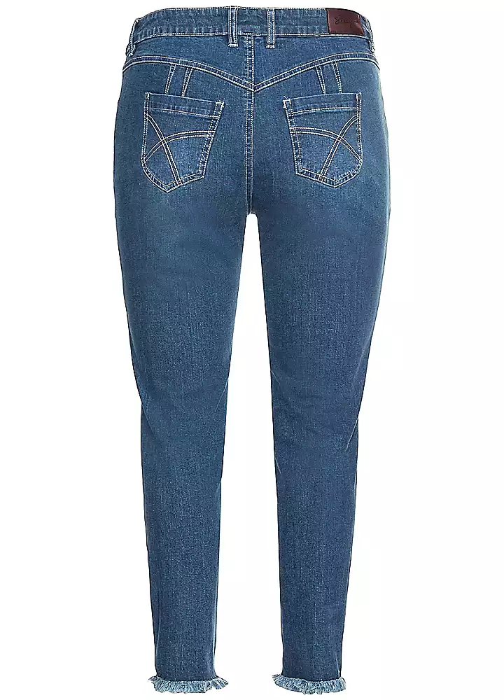 With these slim-cut Sheego jeans, the hem with destroyed effects and fringes provides the trendy update. The individual wash is given fashionable pep by the contrasting seams, a shaped waistband with belt loops, button and zipper as well as the typical five pockets complete the style.