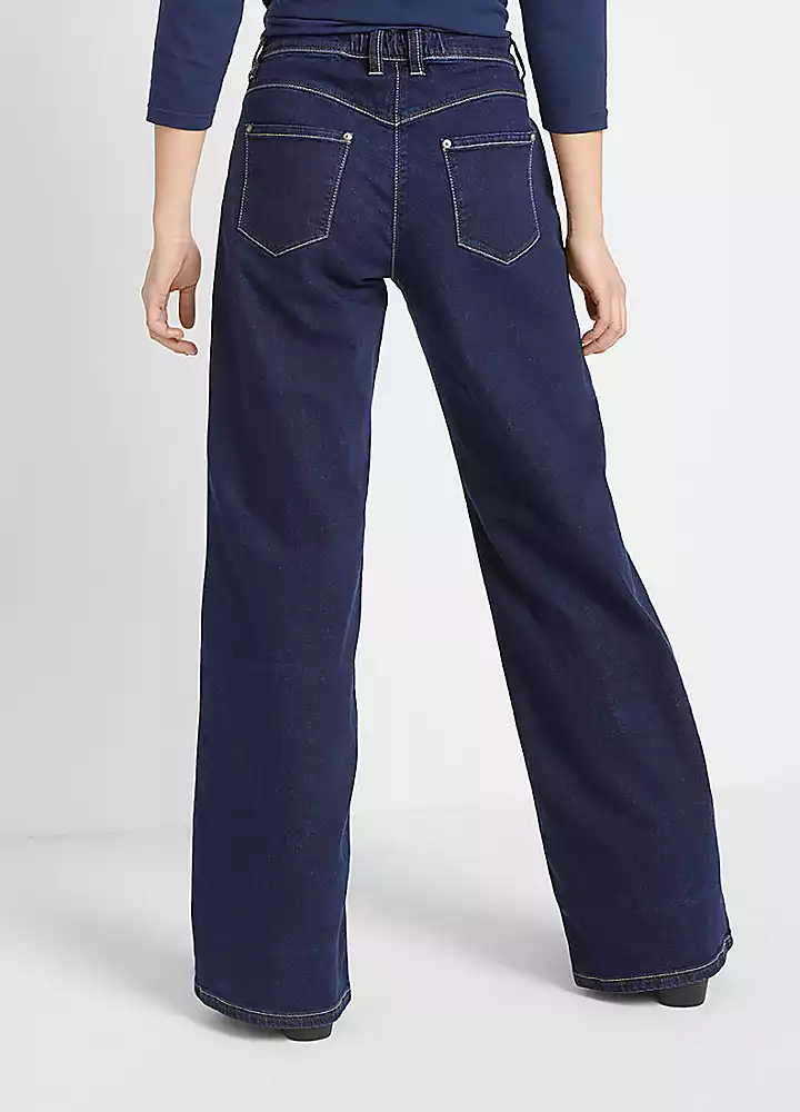 A pair of 5 pockets jeans with extra wide legs and a comfortable waistband.